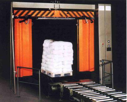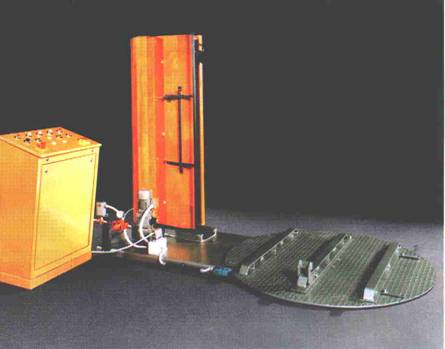s integrovaným otočným stolem, teplovzdušným spalovacím systémem Venturi a rozvaděčem. Paleta je paletizačním vozíkem dopravena na otočný stůl (přístup ze tří stran). Připravený paletizační pytel je ručně navléknut na paletu s nákladem. Po spuštění smršťovacího cyklu jsou automaticky zažehnuty teplovzdušné spalovací trubice Venturi (10 kusů) nebo spuštěn elektroohřev a současně je uveden do chodu otáčecí stůl. Po otočení stolu o 360° je automaticky uzavřen přívod topného media.